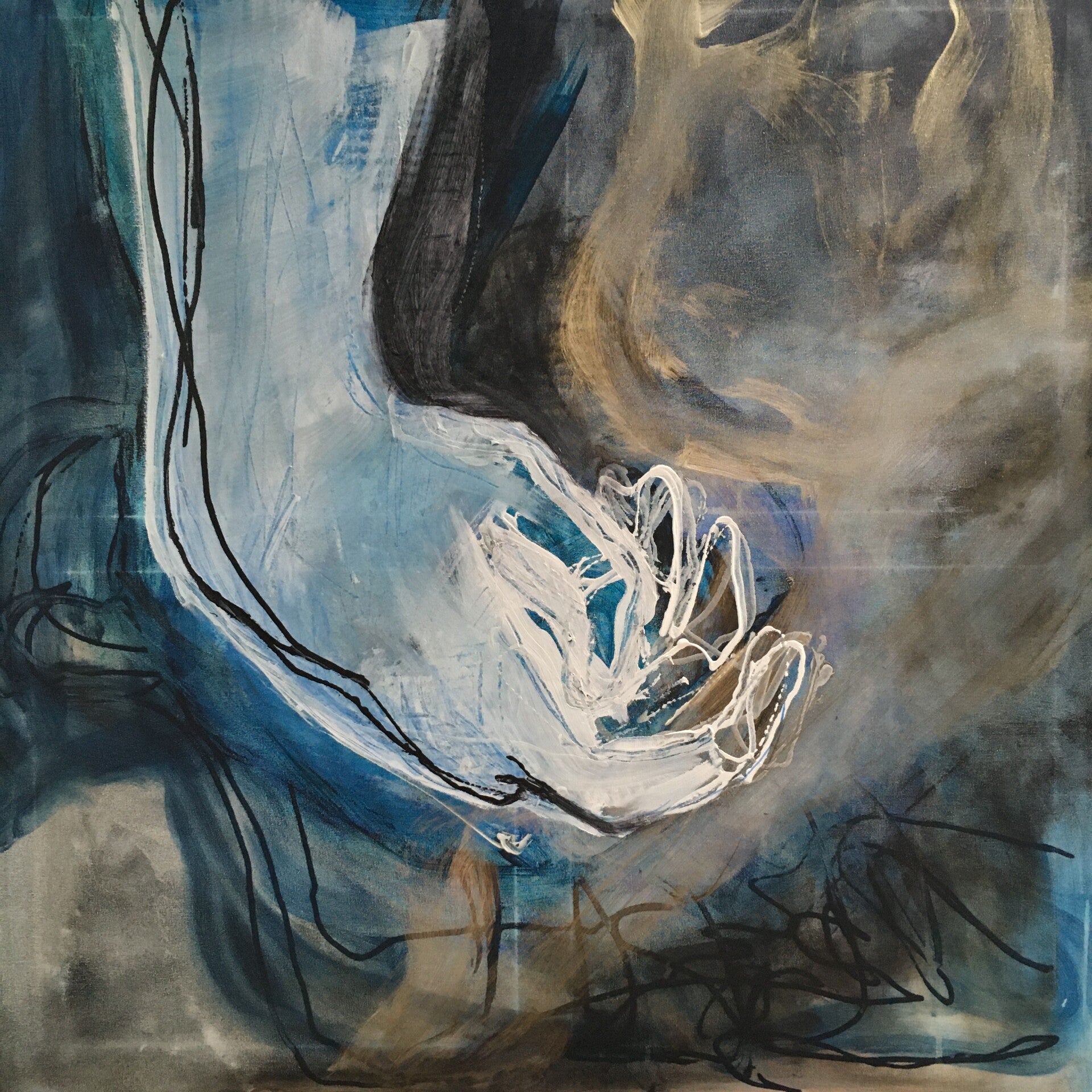 Dit werk laat zich niet zomaar in één blik vangen. De achtergrond— een diepe, bijna stoffige blauwtoon — voelt als een soort rustige ruimte waarbinnen iets levends begint te bewegen. Daaroverheen slingert een fel oranje lijnenspel dat doet denken aan iets tussen wortels, draden en spontane gedachtekrabbels.