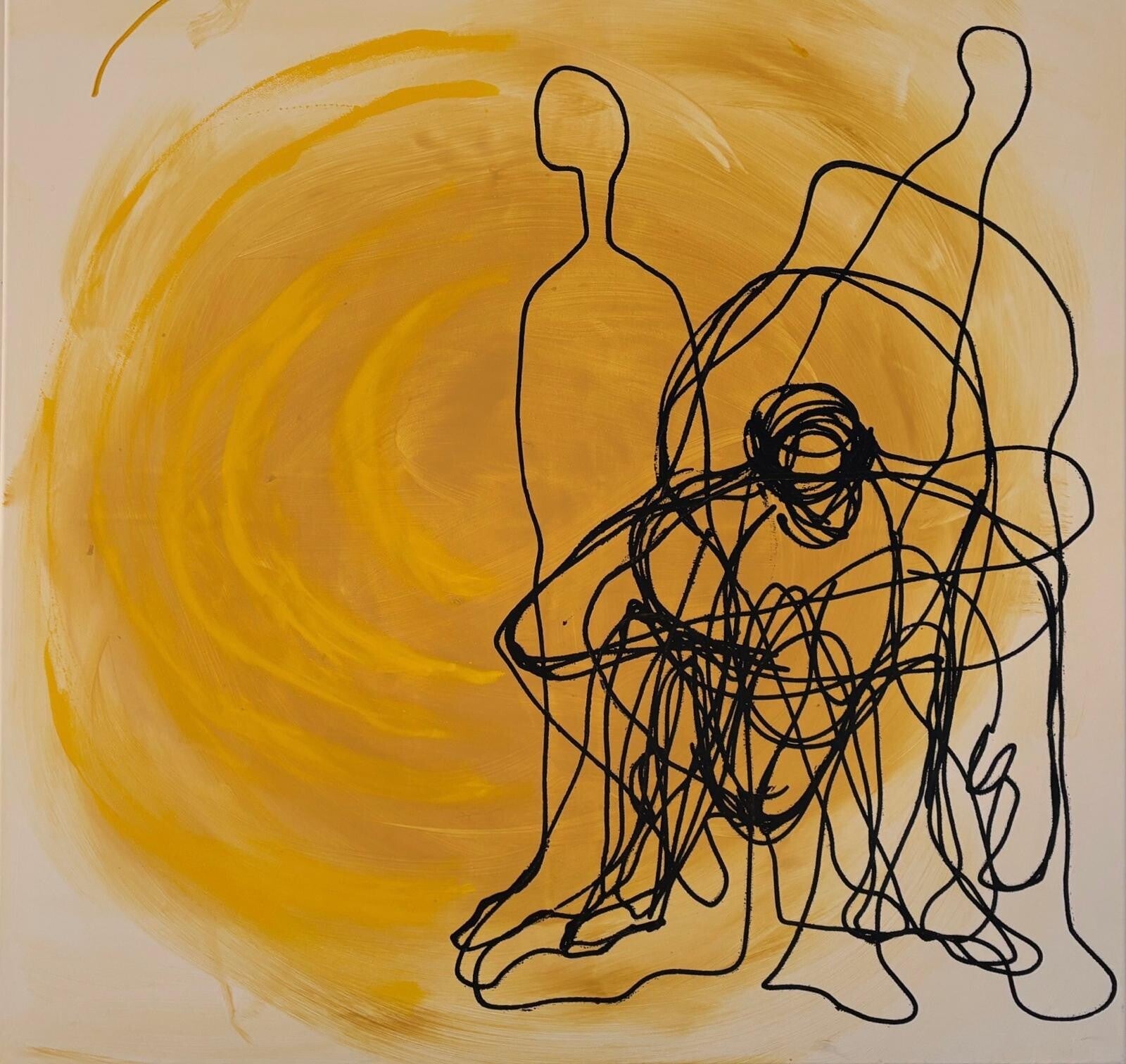 (Wij zien een koppel, eerst twee wezens apart en dan verstrengeld… neen , niet romantisch tegen elkaar geplakt, maar in lusten en lasten verweven. En dan is de zon ( op de achtergrond) altijd aanwezig)